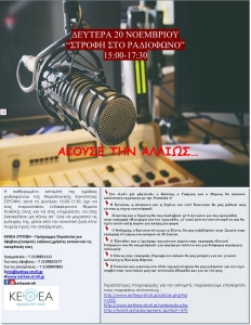 Τη Δευτέρα 20 Νοεμβρίου 2023 και ώρα 15.00, κάνε κλικ στο διαδικτυακό ραδιόφωνο STROFI με την ομάδα ραδιοφώνου της Θεραπευτικής Κοινότητας ΣΤΡΟΦΗ ΣΤΡΟΦΗ ΣΤΟ ΡΑΔΙΟΦΩΝΟ