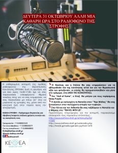 Τη Δευτέρα 31 Οκτωβρίου 2022 και ώρα 15.00, κάνε κλικ στο διαδικτυακό ραδιόφωνο STROFI με την ομάδα ραδιοφώνου της Θεραπευτικής Κοινότητας ΣΤΡΟΦΗ ΣΤΡΟΦΗ ΣΤΟ ΡΑΔΙΟΦΩΝΟ