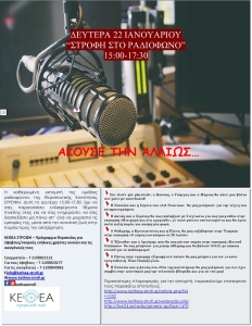 Τη Δευτέρα 22 Ιανουαρίου 2024 και ώρα 15.00, κάνε κλικ στο διαδικτυακό ραδιόφωνο STROFI με την ομάδα ραδιοφώνου της Θεραπευτικής Κοινότητας ΣΤΡΟΦΗ ΣΤΡΟΦΗ ΣΤΟ ΡΑΔΙΟΦΩΝΟ