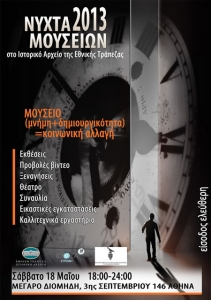 Το Ιστορικό Αρχείο της Εθνικής Τράπεζας, το Κέντρον Ερεύνης της Ελληνικής Λαογραφίας της Ακαδημίας Αθηνών και το θεραπευτικό πρόγραμμα ΚΕΘΕΑ Στροφή, σε συνεργασία με 10 καλλιτέχνες, διοργανώνουν εκδηλώσεις στο πλαίσιο της Διεθνούς Ημέρας Μουσείων 2013.
